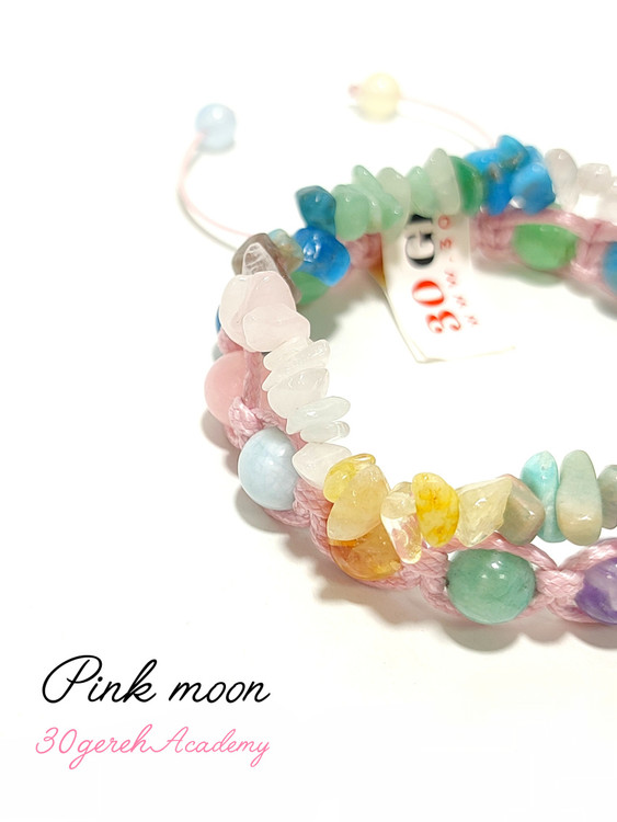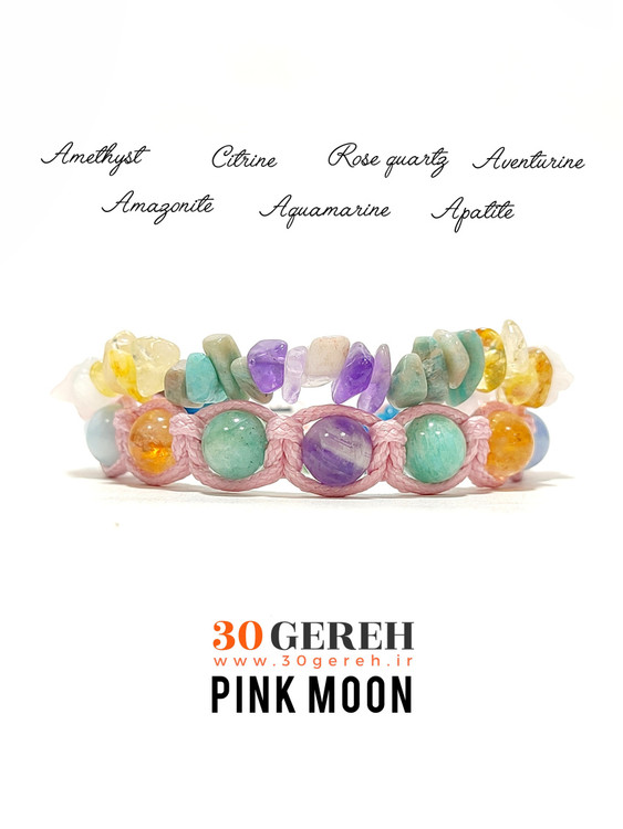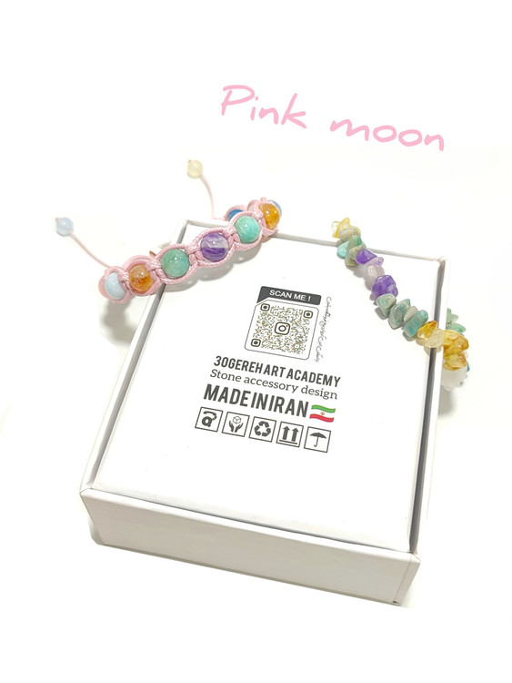 این دستبند با استفاده از 7 نوع گوهر سنگ اصل و معدنی طراحی شده است و طبق روال گذشتهٔ محصولات آکادمی هنری سی گره ، ست دستبند سنگی دوتایی « ماه صورتی » نیز بصورت انحصاری توسط تیم سی گره طراحی و تولید شده است و تحت برند « سی گره » ارائه میشود .